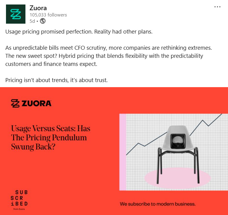 Zuora posted on LinkedIn (Jan 6) that “usage pricing promised perfection. Reality had other plans”, so now they’re positioning hybrid pricing, meaning blending fixed and usage components as the market solution.